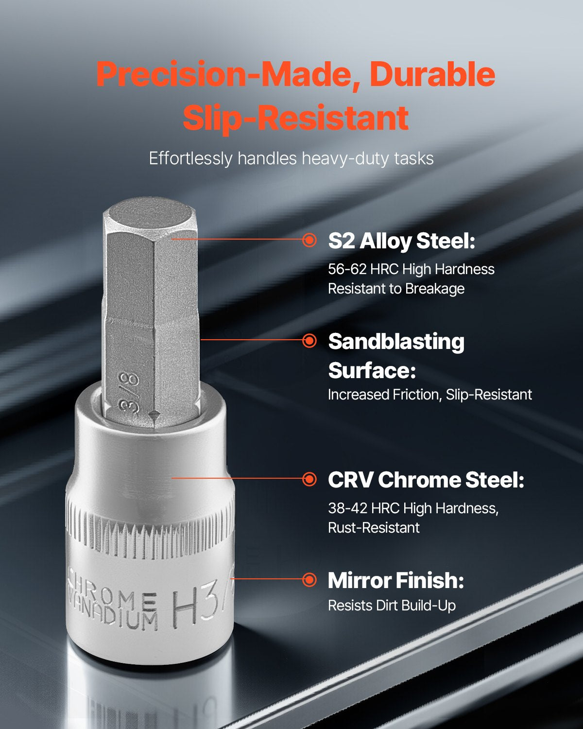 Rostbeständig och hållbar: Tillverkad av S2-legerat stål med hög hårdhet och CRV-förkromat stål, har sexkantssockets ytor sandblästring och spegelpolering. Denna design motstår brott och korrosion, vilket säkerställer år av tillförlitlig användning.