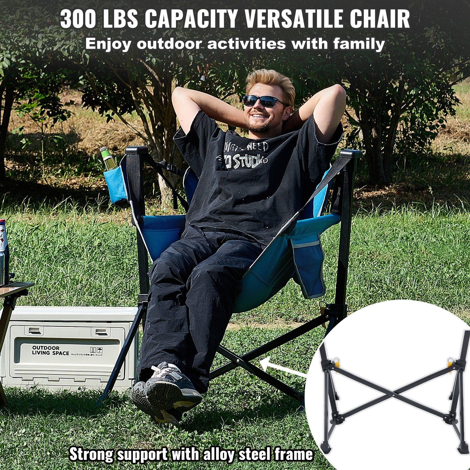 Byggd för att hålla: Tillverkad av legerat stål, den liggande lägerstolens ram är styv och stabil, med en triangelstödsbas som rymmer upp till 300 lbs. Det hållbara 600D Oxford-tyget och den pulverlackerade finishen förbereder den här stolen för vad som helst utomhus.