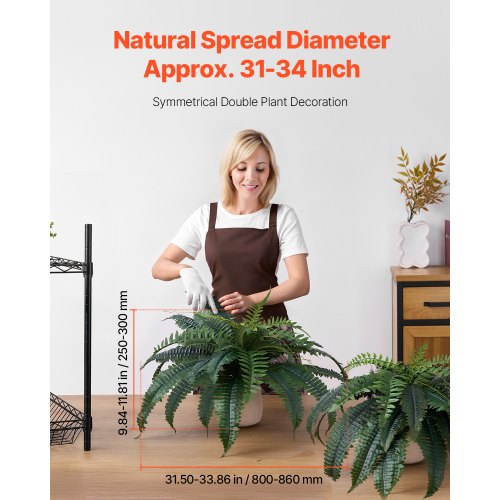 2 plantor per set: Varje set innehåller 2 konstgjorda ormbunkar. På grund av fraktkompression måste du manuellt vika ut bladen och stjälkarna när du mottagit produkten. När de är utvikta är den naturliga spridningen för varje ormbunke cirka 86 till 90 cm.