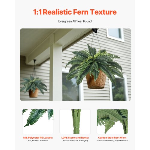 Realistisk textur: Bladen på dessa konstgjorda ormbunkar är tillverkade av PE och sidentyg, vilket ger den mjuka, flexibla texturen hos riktiga växtblad samtidigt som de motstår blekning. Stammarna och rötterna är också väderbeständiga och hållbara, behåller formen och naturtrogna kvaliteten.