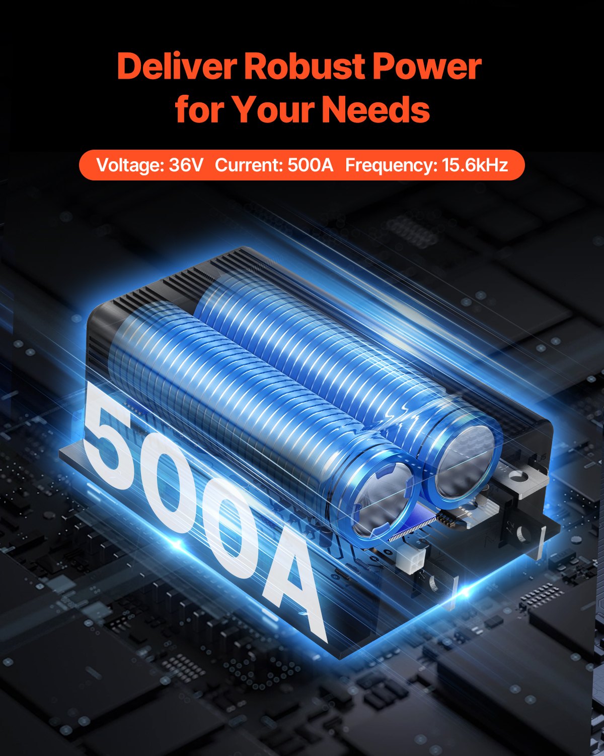 Stabil prestanda: Med 36V och 500A uteffekt levererar denna golfbilsmotorstyrenhet jämn, stadig kraft till motorn. 15,6 kHz högfrekvensreglering och snabbstartsfunktion förbättrar effektiviteten och känslig acceleration. Den stöder steglös hastighetsjustering och backbromsning för exakt och sömlös körning