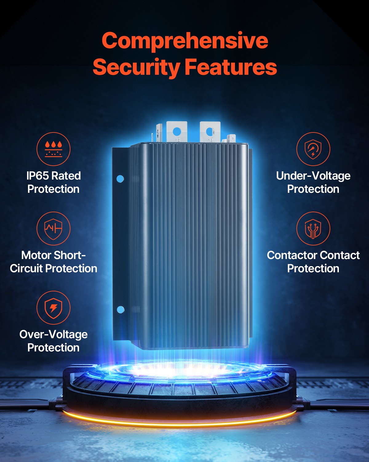 All-Around-skydd: Denna golfbilskontroller har inbyggt motorkortslutning, överspänning, underspänning, kontaktorkontakt och temperaturskydd. IP65 vattentät är lämplig för hårt väder och utmanande miljöer, vilket säkerställer säker och pålitlig drift
