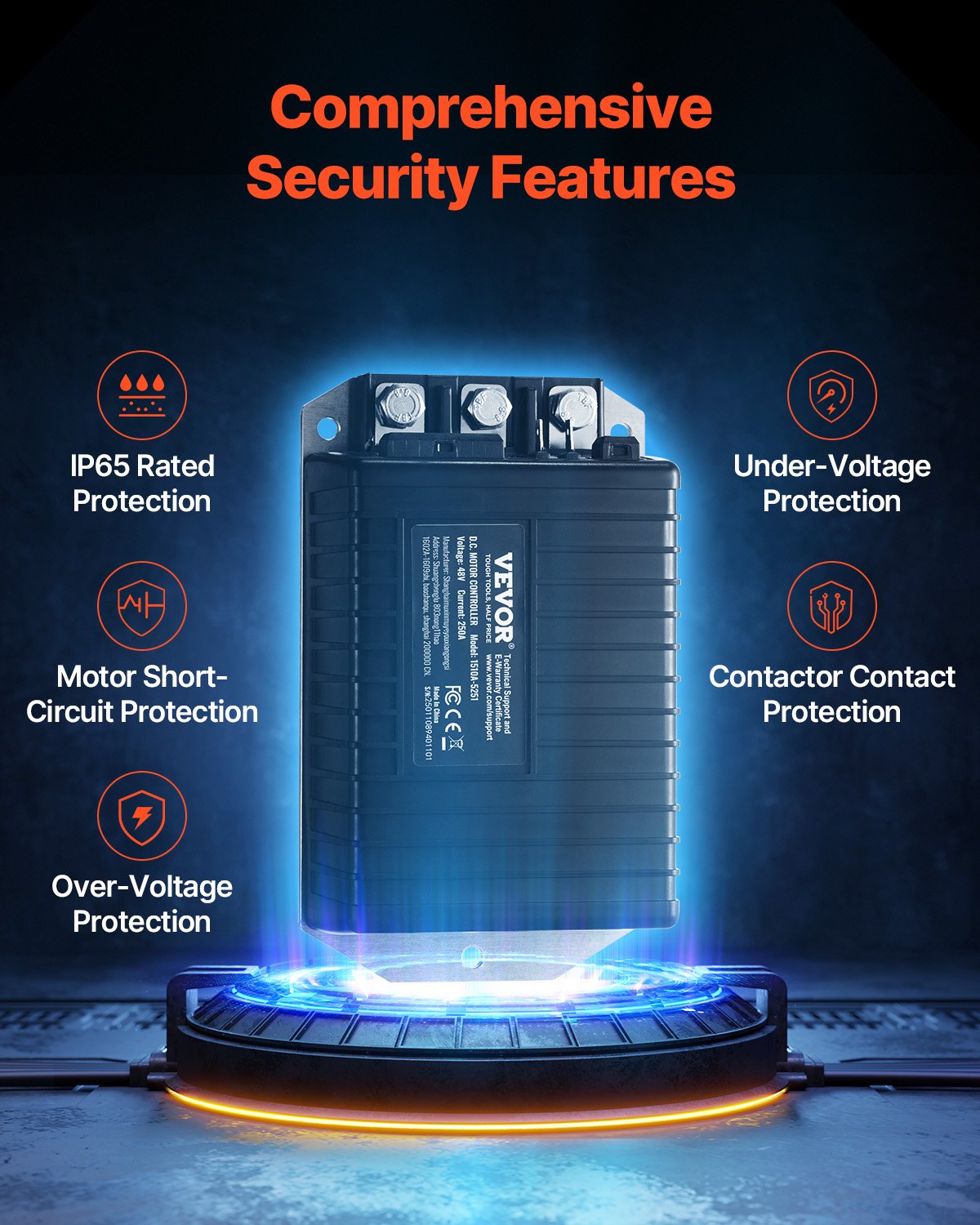 All-Around-skydd: Denna golfbilskontroller har inbyggt motorkortslutning, överspänning, underspänning, kontaktorkontakt och temperaturskydd. IP65 vattentät är lämplig för hårt väder och utmanande miljöer, vilket säkerställer säker och pålitlig drift