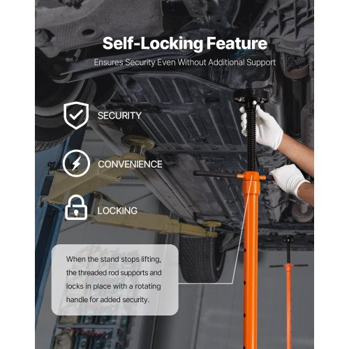 Självlåsande funktion för enkel användning: Den gängade skruvstången har en självlåsande funktion för att förhindra att stativet sänks ner utan hjälp. Justering av domkraften under fordonet är också mycket säker. Gummihandtaget ger ett bekvämt grepp.