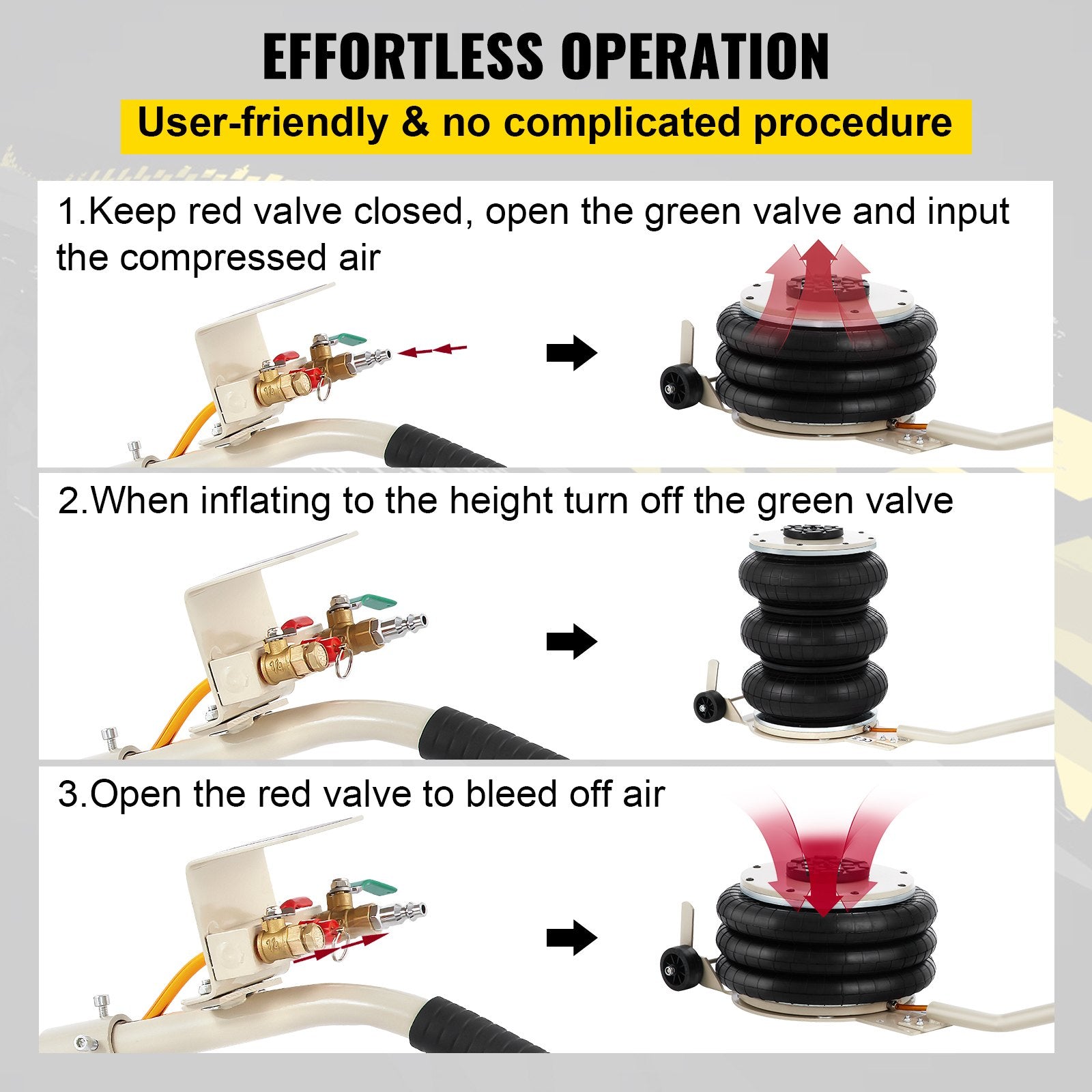 Kraftig konstruktion: Vår pneumatiska domkraft är ett höghållfast stål som gör hela kroppen robust och hållbar. Mycket täta krockkuddar kommer inte att läcka eller repas. Dessutom är våra hjul bättre lämpade för terräng, vilket hjälper dig att underhålla din bil när som helst, var som helst.