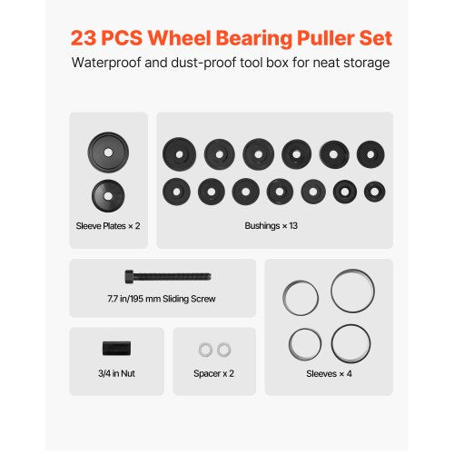 Praktisk förvaring: Hjullagersavdragaren levereras med en vattentät plastlåda för att organisera bussningar, hylsor och hylsplattor snyggt efter storlek. Detta säkerställer säker förvaring av varje del och gör den enkel att transportera vart du än behöver den.