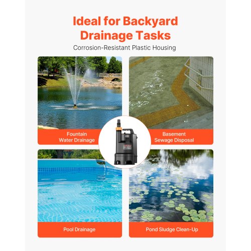 Snabb och effektiv dränering: Utrustad med en robust motor på 690 W (0,93 hk) levererar denna dränkbara sumppump upp till 17 500 l/h (4623 GPH) och når en maximal lyfthöjd på 9 m (30 fot), vilket säkerställer snabb och effektiv dränering av avloppsvatten.