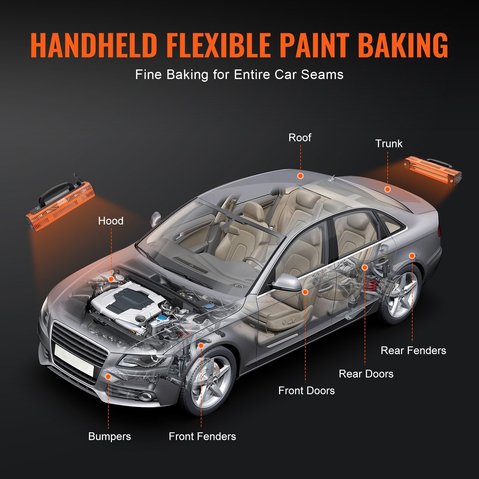 1000W Snabbtorkande: Det handhållna lamphuvudet torkar snabbt primern och täcker 2,48 sq.ft / 0,23㎡. Den kortvågiga infraröda ger hög penetration, och kvartslampröret förbättrar glansen. Den är designad för användare som söker effektiva, snabba och högkvalitativa målningsresultat.