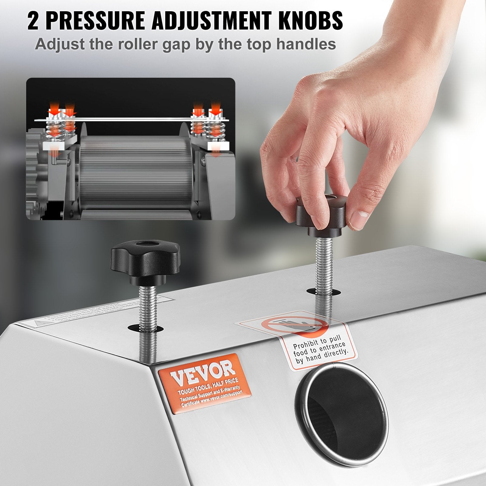 Enkel manuell justering: Med 2 rulltrycksregulatorer placerade ovanpå maskinen kan du enkelt justera rullavståndet efter olika storlekar av käpp. Dessutom kan det 2,4-tums (62 mm) stora matningsinloppet enkelt rymma större sockerrör.