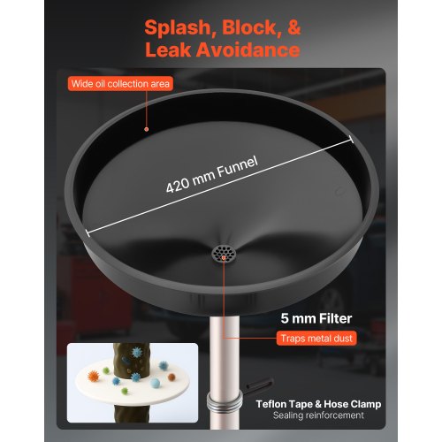 Läckagesäker design: Vår oljeavtappningsbehållare har en 40 cm bred spillsäker tratt, vilket förbättrar oljeåtervinningen. Levereras med extra tätningstejp och klämmor för ytterligare läckageskydd, vilket undviker överfyllning och spill.