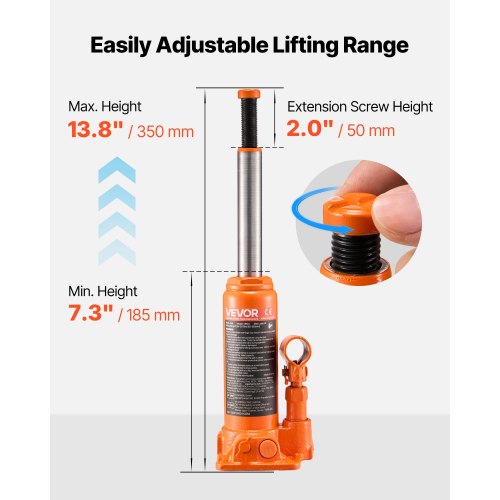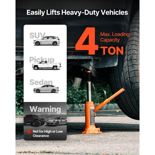 Stabil lyftning: Vår hydrauliska flaskdomkraft hanterar upp till 4 ton (8 818,4 lbs), perfekt för sedaner, små pickuper och SUV:ar. Den fungerar även på jordbruksredskap och kompakta maskiner. För säker lyftning, välj en 4-tons domkraft om ditt fordon väger 2,5 ton eller mindre.