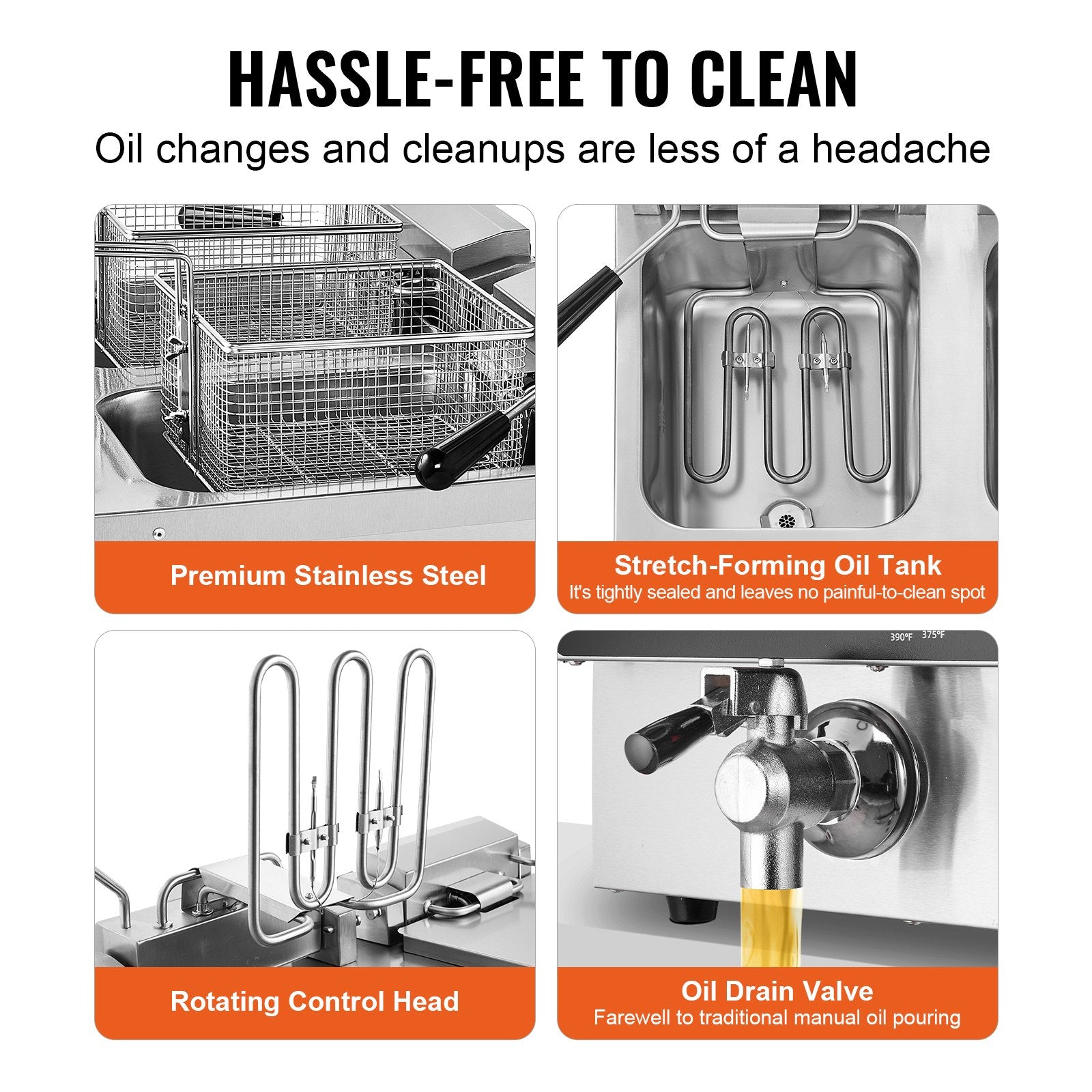Stor kapacitet: Med två separata oljetankar (Vattenkapacitet: Max 9Qt/8,5L vardera, Oljekapacitet: Max 6,2Qt/5,9L vardera) låter denna kommersiella elektriska fritös dig fritera olika typer av mat individuellt och behålla distinkta smaker. Perfekt för delikatessbutiker, koncessionsstånd, snackbarer och fester.