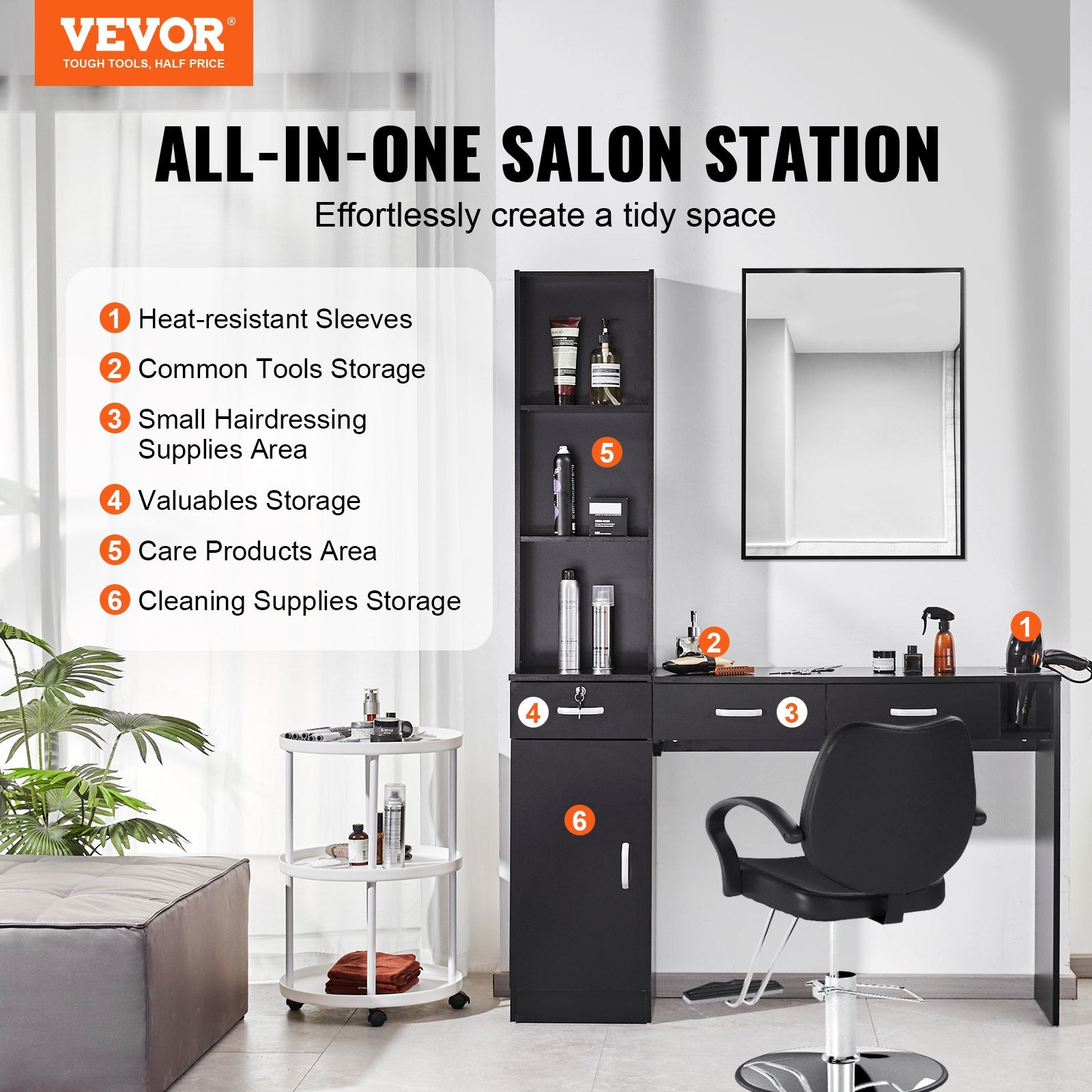 Salong Station, Väggmonterad Frisörsalong Station för frisör, Beauty Spa Möbelset, 1 förvaringsskåp, 3 öppna Cubbies och 3 lådor (en låsbar), svart