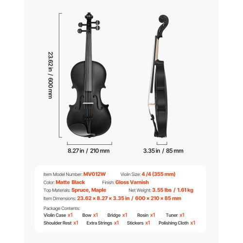 4/4-fiol: Denna storlek på fiolen är idealisk för användare från 12 år med en armlängd på 23+ tum (584,2+ mm). Det är ett idealiskt fiolinstrument för nybörjare eller artister och är utmärkt för lektioner, framträdanden eller hemmaövning.