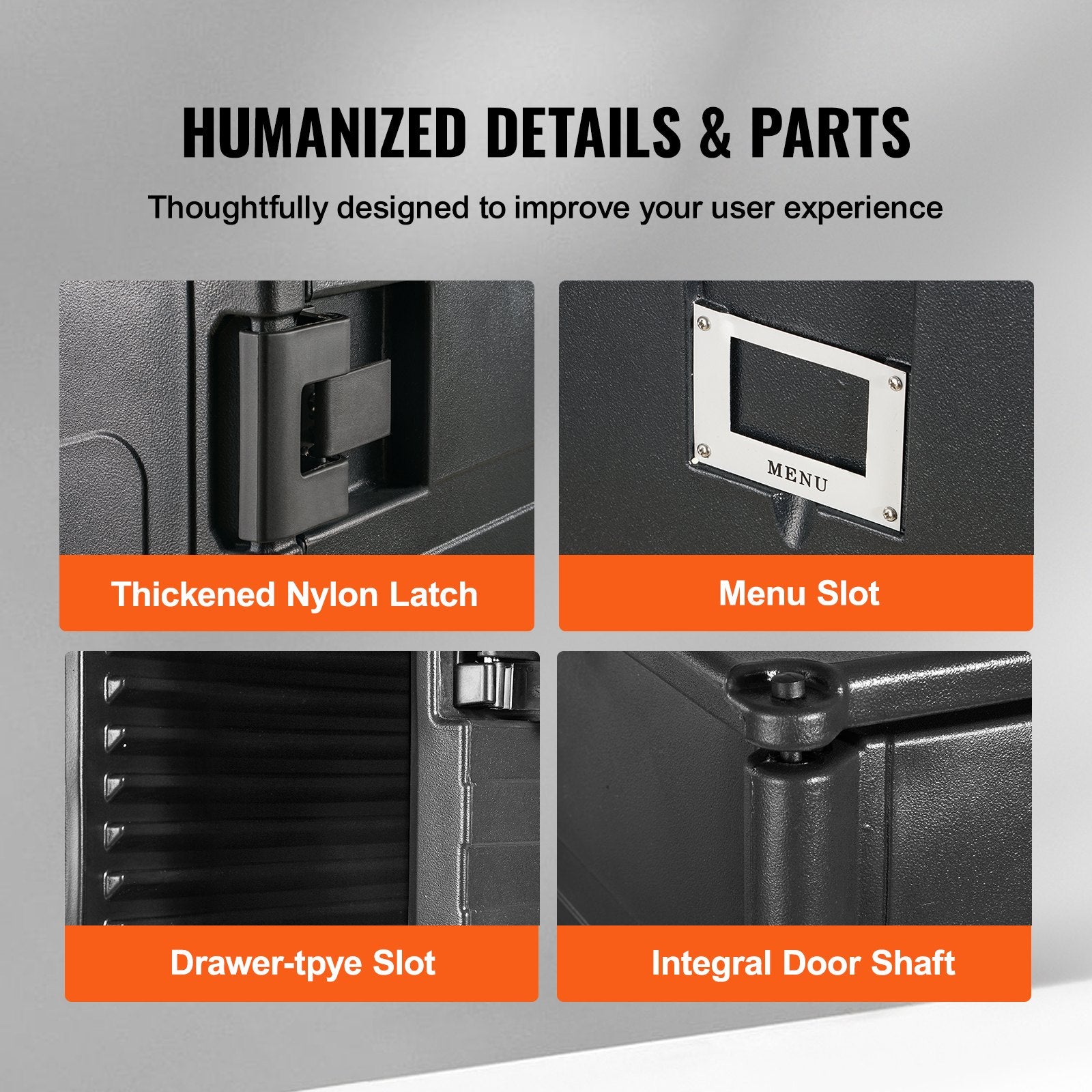 Stor intern kapacitet: Få plats med all din mat på en gång! Med en kapacitet på 82 QT kan våra varmboxar för catering rymma sex höga 2,5 tums mattallrikar eller tre 6,5 tums mattallrikar. Du kan transportera en stor mängd mat på en gång. Med design med flera fack kan du fritt kombinera och allokera det interna utrymmet, och det rekommenderas att förvara varm och kall mat separat.