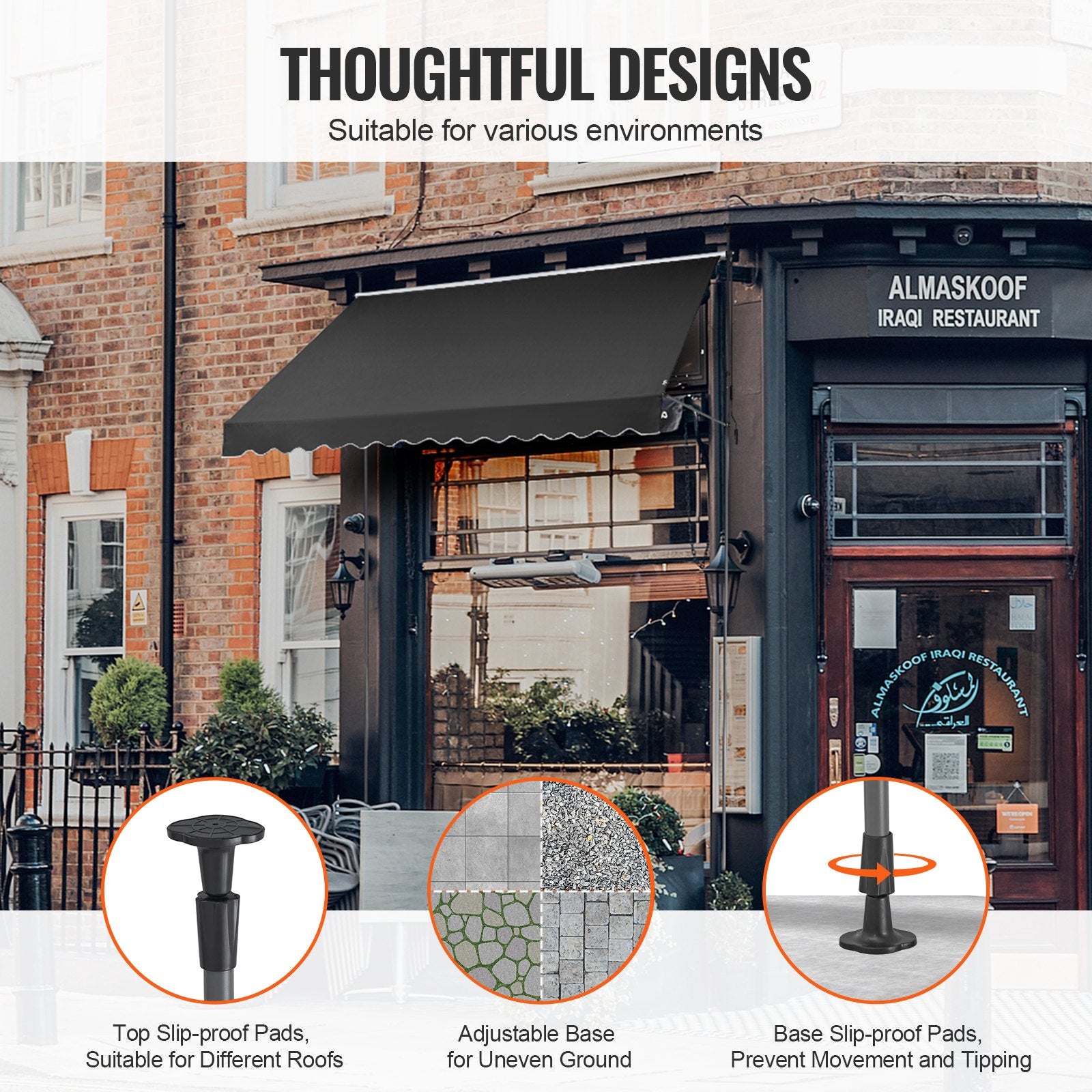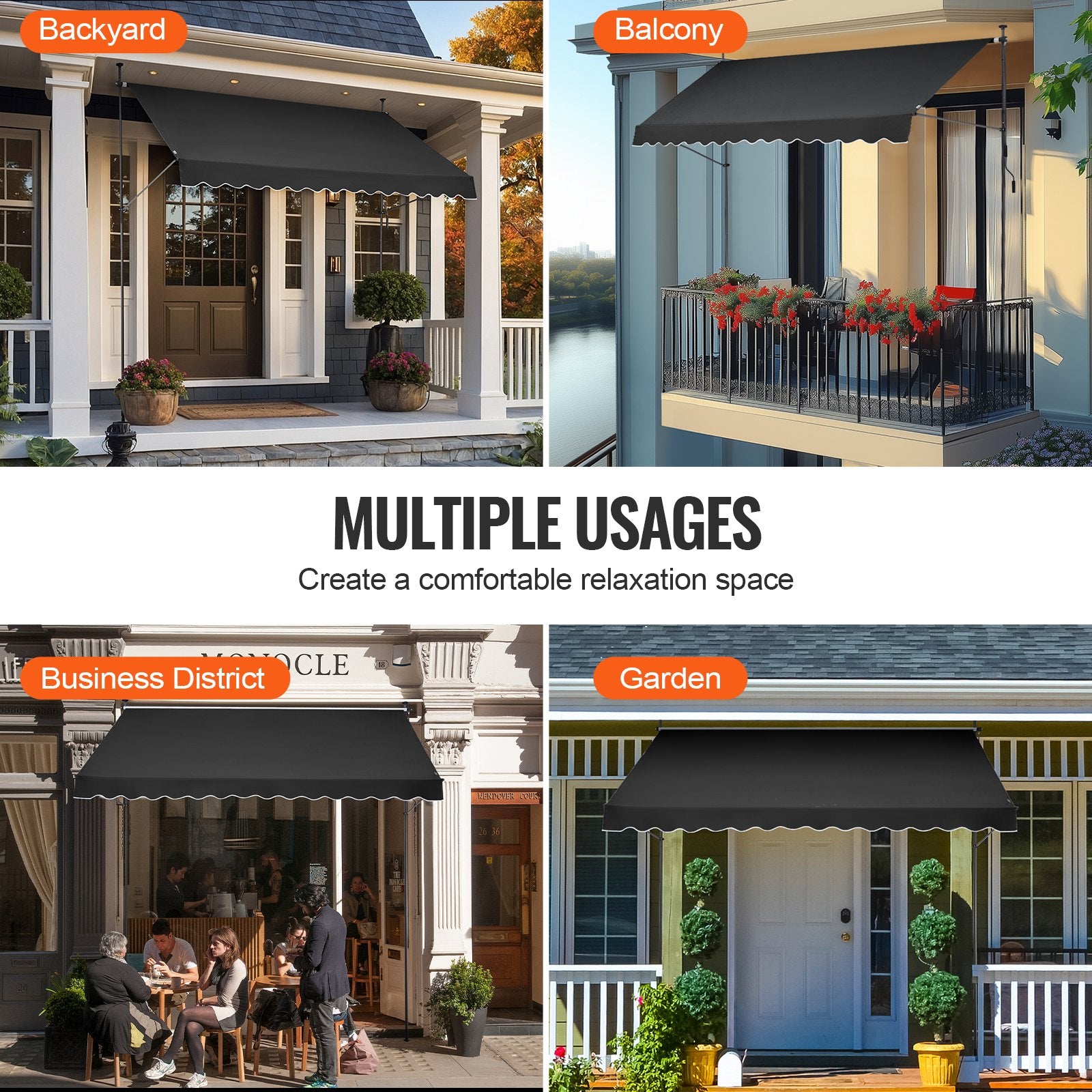 Mångsidiga applikationer: Idealiska för trädgårdar, balkonger och uteplatser, dessa markiser för uteplats ger snyggt solskydd och komfort och förvandlar ditt utomhusområde till en avkopplande oas.