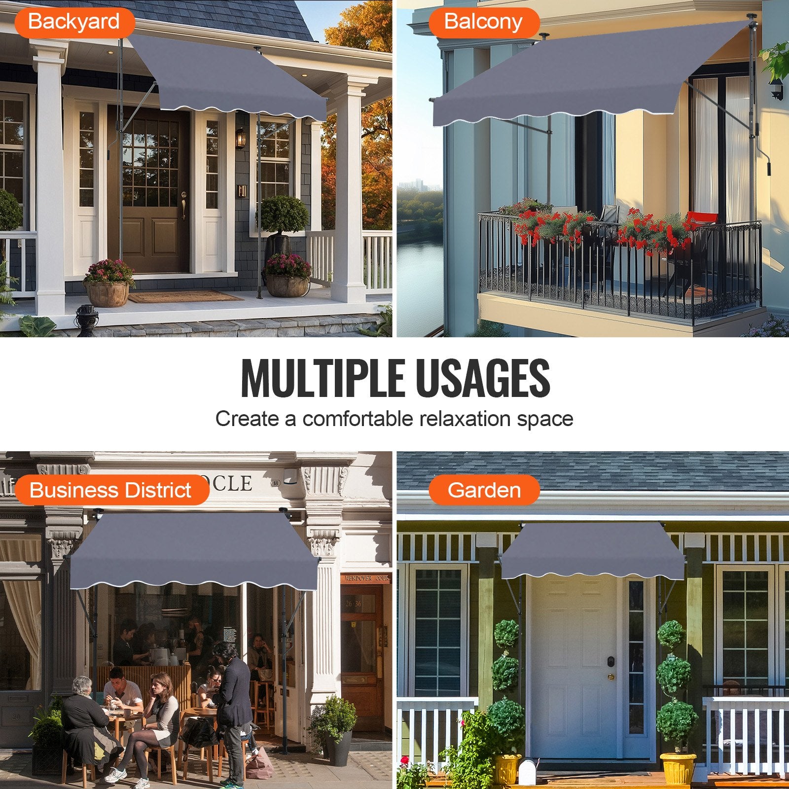 Lätt att justera: Den här manuella infällbara markisen tillåter höjdjusteringar mellan 86-122 tum, och rymmer olika dörr- och fönsterhöjder, vilket ger flexibilitet för ditt utomhusutrymme.