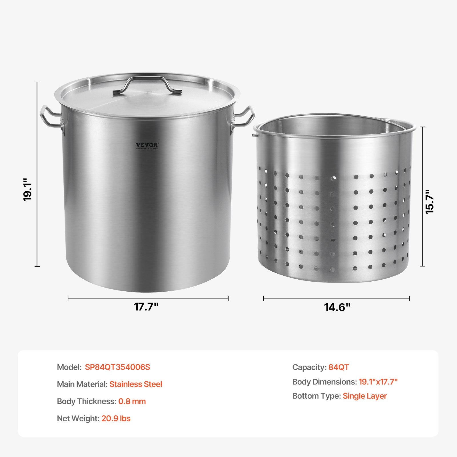 84 QT / 79,5 L Stor kapacitet: Innermåtten på krukan är 17,7" x 19,1" / 450 x 485 mm. Den kan användas för att ånga stora hummer, steka kalkoner, koka soppor, koka rätter och mer, vilket gör den lämplig för restaurangkök och familjer som ofta är värd för sammankomster.
