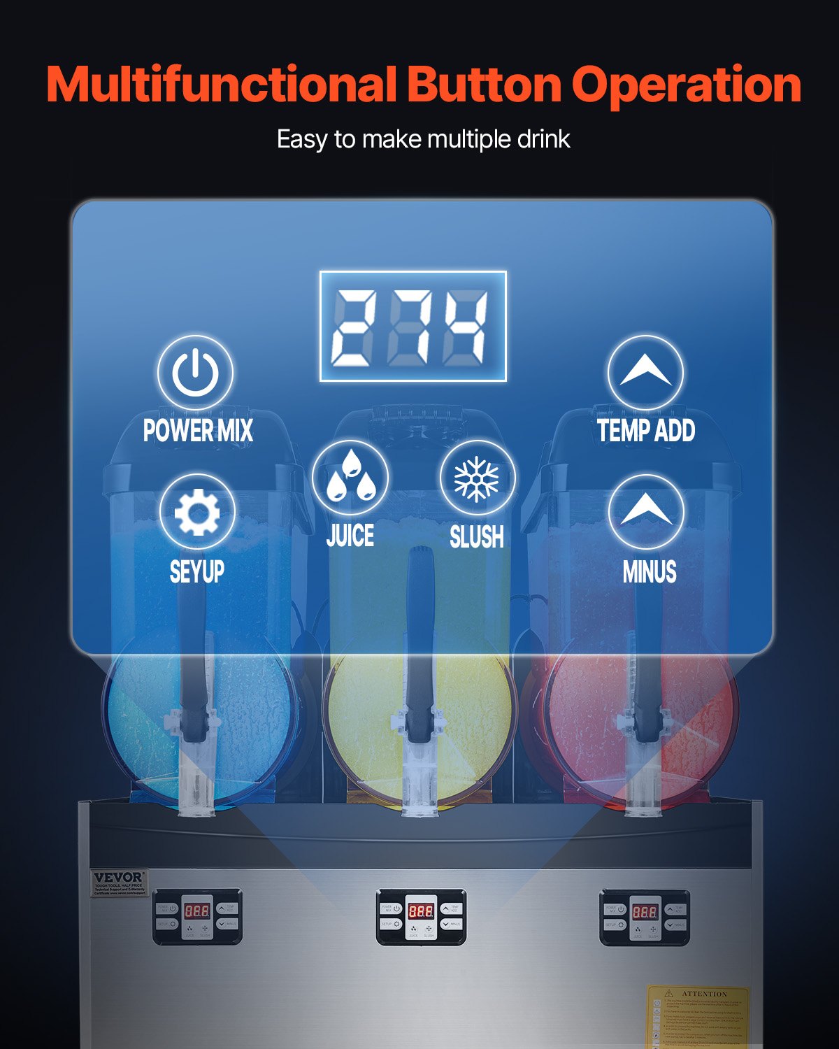 3 tankar oberoende inställningar: Med tre 12L / 3,17 GAL kapacitetstankar, kan denna slaskiga maskin göra cirka 144 koppar slaskiga drycker per sats, du kan välja att använda varje tank oberoende. Den kräver mindre frekvent påfyllning, vilket gör den perfekt för kommersiellt bruk med hög trafik. Den genomskinliga tanken visar vackert upp färgglada drycker, vilket gör den perfekt för glassbutiker, hamburgare, kaféer, barer och andra kommersiella miljöer.