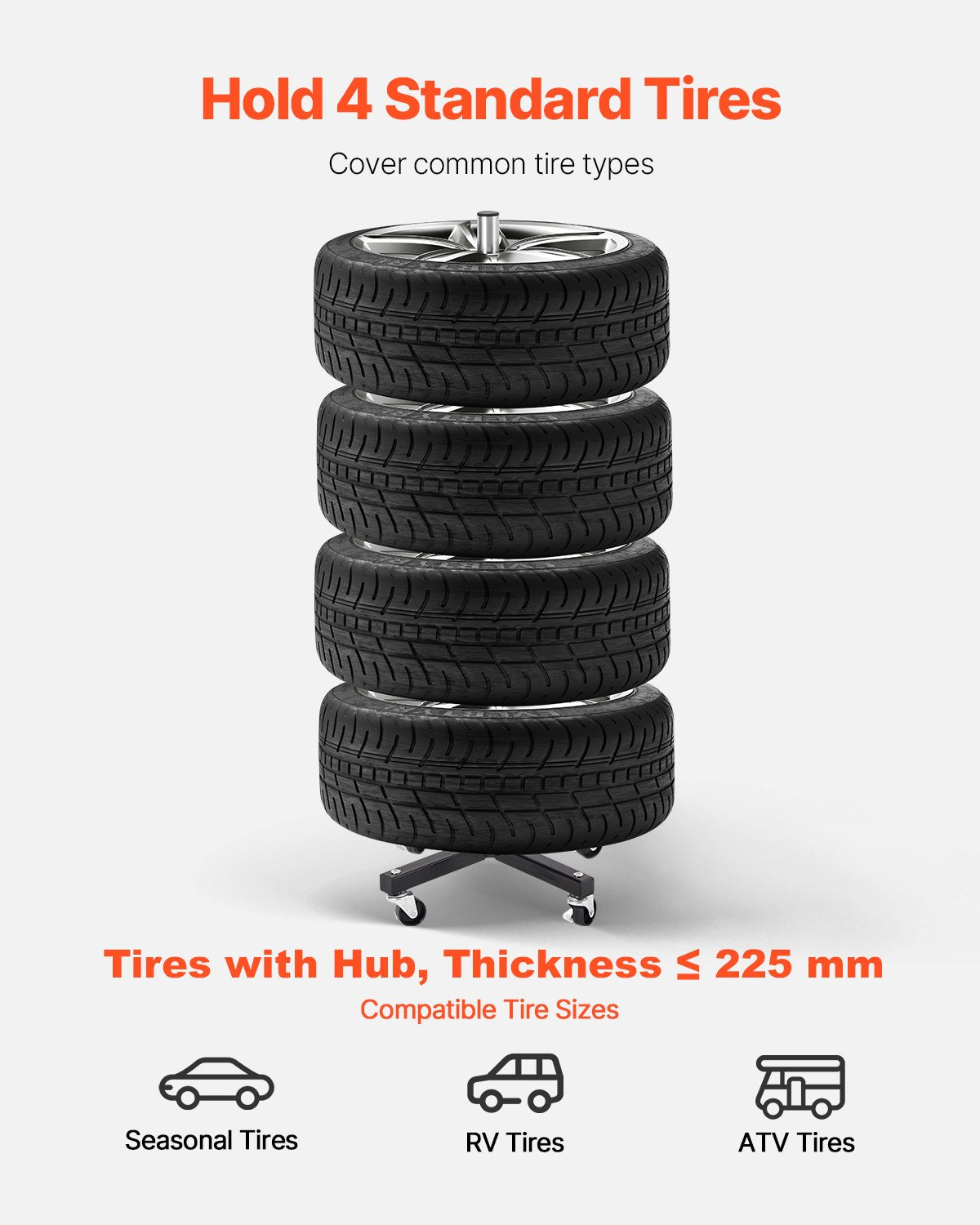 Stark lastkapacitet: Med en robust viktkapacitet på upp till 220 lbs (100 kg) kan denna mobila däckhållare säkert hålla upp till 4 däck med fälgar (upp till 225 mm breda), vilket ger en pålitlig förvaringslösning som håller dina däck snyggt organiserade.