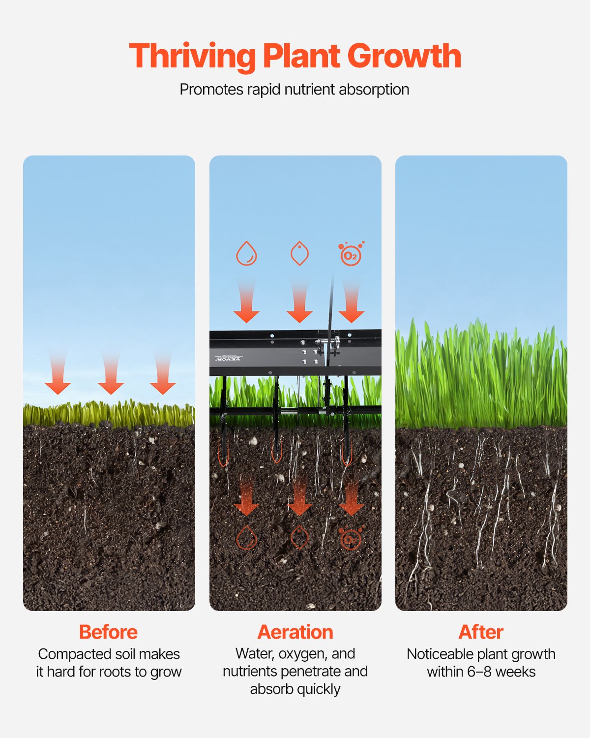 Främjar växttillväxt: Denna släp bakom gräsmattans pluggluftare förbättrar markstrukturen genom att skapa hål som levererar mer vatten och syre till växter, och undviker gulning eller förfall orsakad av syre- och vattenbrist. Inom 6-8 veckor kommer du att se en märkbar tillväxt i dina växter.