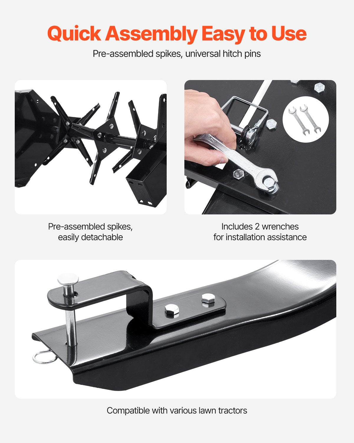 Snabbinstallation: Vårt gräsmatta luftardrag bakom kommer med förinstallerade spikar och inkluderar 2 skiftnycklar för enkel installation. Du kan börja använda den direkt vid leverans. I paketet ingår även en detaljerad manual för tydliga instruktioner och säkerhetstips.