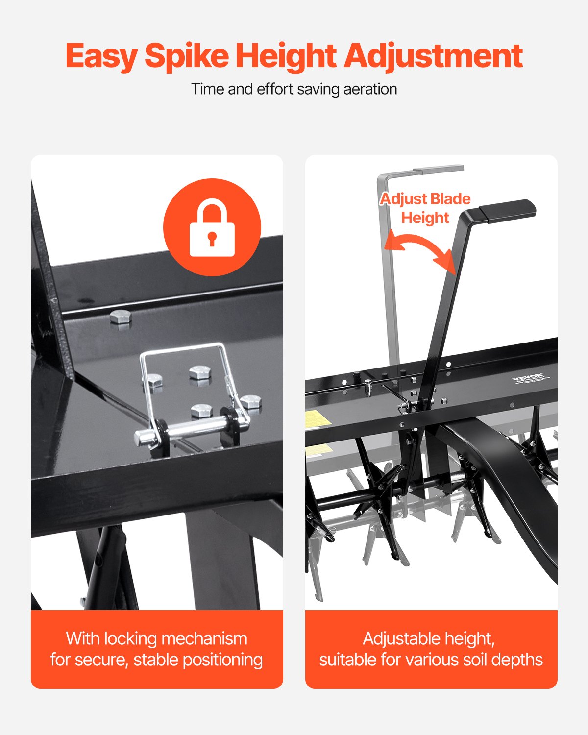 140lbs lastkapacitet: Brickan med hög lastkapacitet bakom luftaren gör att du kan placera tyngre föremål, vilket ökar spetspenetreringskraften. Varje spik är designad med en skyddande kant för att minska riskerna. De förstärkta stängerna och universalkopplingen ansluts enkelt till olika traktorer och är hållbara och hållbara.