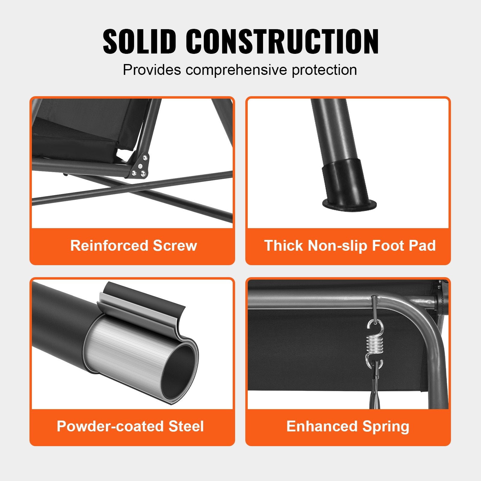 Konstruktion av legerat stål: Tillverkad av slitstarkt legerat stål, denna uteplatsgunga har en robust triangelram som är resistent mot höga temperaturer och nötning. Den tål utomhuselement utan att rosta och stöder upp till 440 lbs, och rymmer bekvämt 2 personer för att svänga kul.
