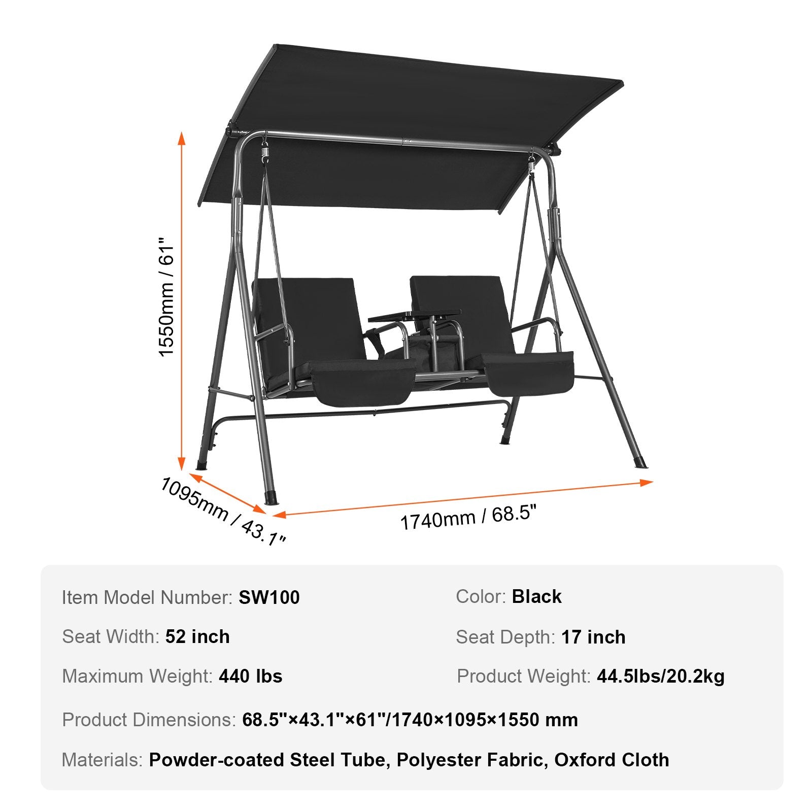Tyg av utomhuskvalitet: VEVOR uteplatsgungor med kapell har ett rymligt säte och ryggstöd, båda tillverkade av Oxford-tyg av utomhuskvalitet, vilket säkerställer en sval och andningsbar upplevelse även på sommaren. Den böjda designen av sätet och ryggstödet anpassar sig till din ryggrad för bekväma sittplatser.