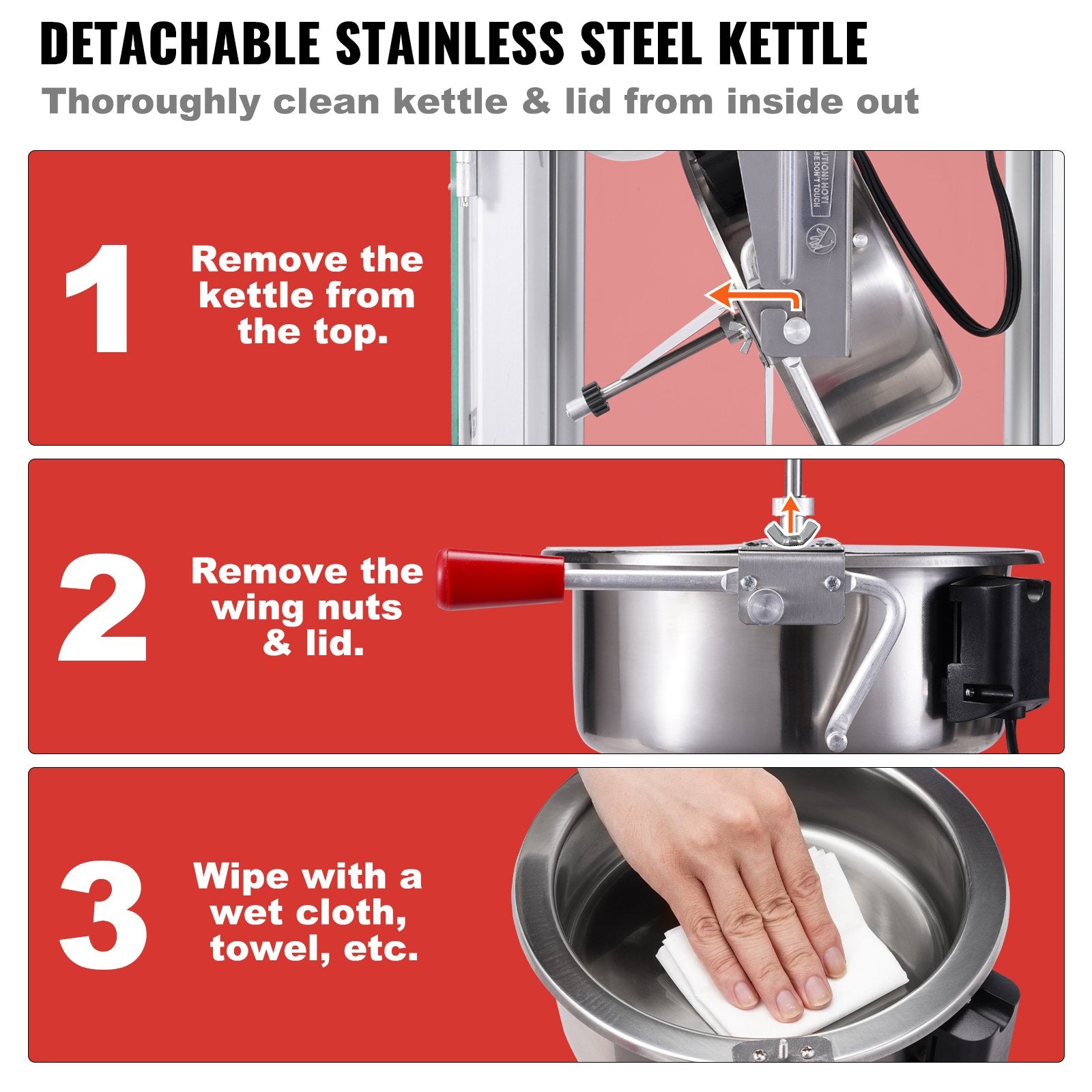 Hållbar struktur, lätt att rengöra: Denna popcornmaskin i biostil är gjord av en kallvalsad tallrikram och härdade glaspaneler, designade för frekvent användning. Dörren med en magnetisk spärr möjliggör snabb åtkomst och förbättrar presentationen av popcornen inuti. Den tryckta grafiken på toppen kan också locka några hungriga ögon. Dessutom gör vingmuttern på vattenkokaren lätt att ta bort locket för grundlig rengöring. Enkel rengöring förlänger maskinens livslängd.