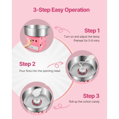 Enkel att använda: Att använda den här maskinen är enklare än någonsin. Slå på strömmen, justera spänningen, värm upp i 2-3 minuter och häll socker i snurrhuvudet. Sedan behöver du bara använda pinnarna för att samla upp sockervadden. Även första gången är det enkelt att göra en perfekt sockervadd.