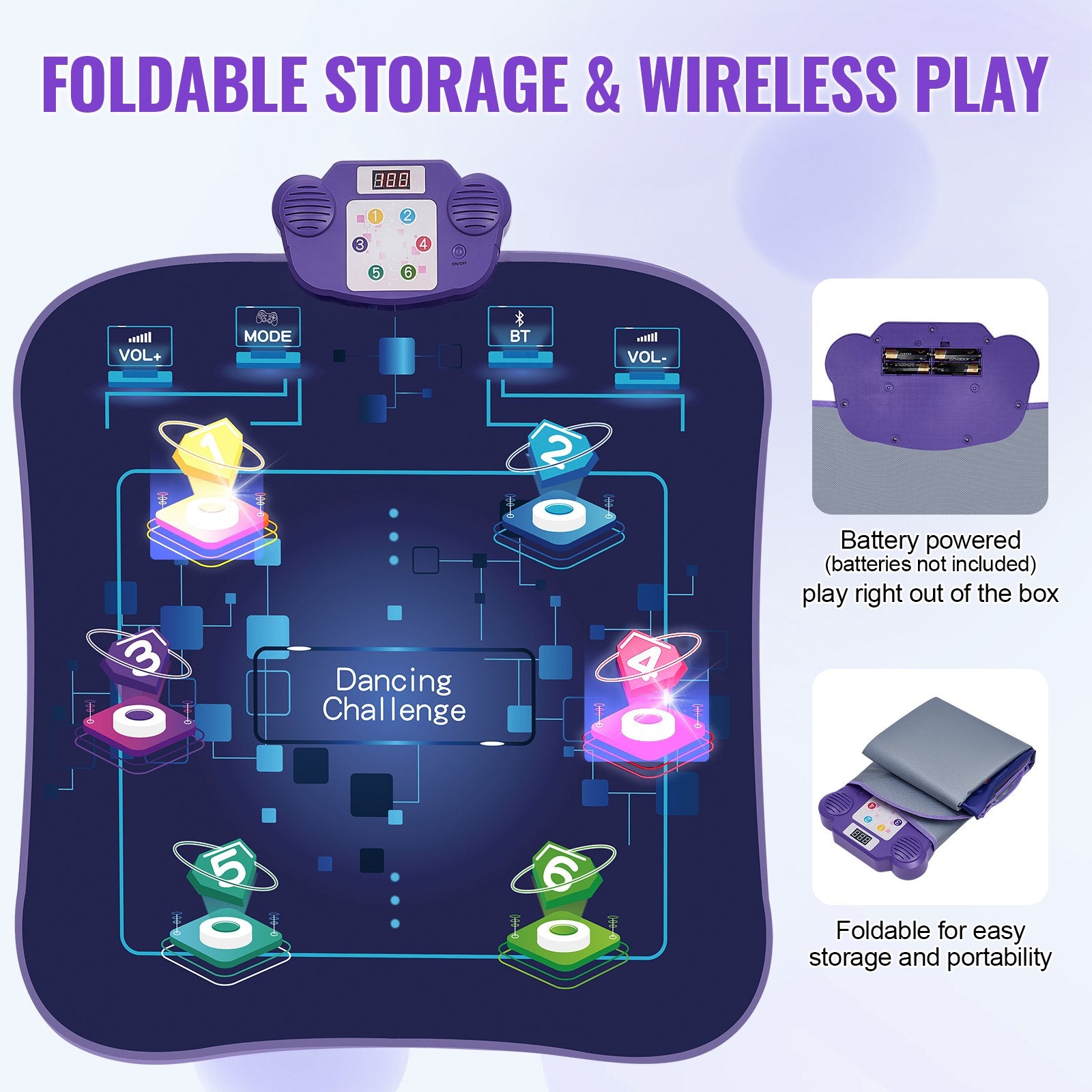 Lätt att förvara och bära: Vik, gå och dansa var som helst! Lätt och mjuk, denna dansdyna viks snyggt för enkel förvaring, vilket sparar utrymme. Med sin trådlösa och bärbara design drivs den på 4 AA-batterier (ingår ej), så att du kan dansa när som helst, var som helst – inga sladdar eller krångel! LED-pilar med ljusstyrning gör det lättare att följa.