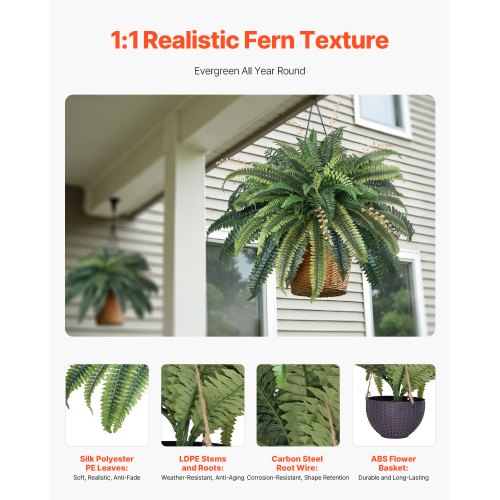 Häng eller lägg platt: Denna konstgjorda Boston-ormbunke kan placeras i en ampel, och dess lätta design förhindrar att den faller på grund av vikt. Alternativt kan du placera den i en kruka och lägga den platt på marken för att dekorera din veranda eller ditt rum.