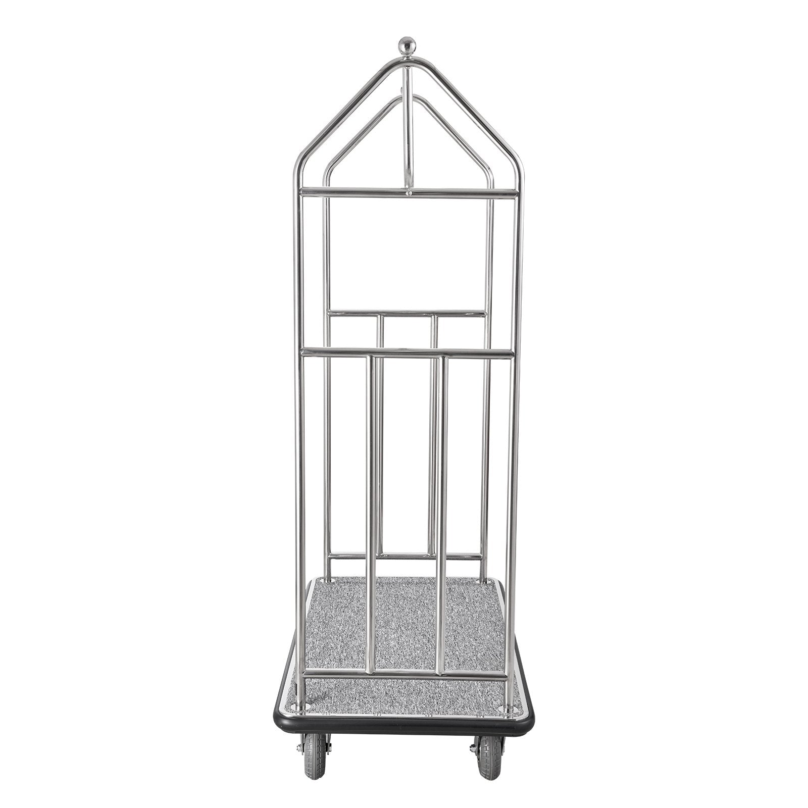Slitstark och elegant design: Tillverkad av 1 mm tjockt rostfritt stål, denna bellman-vagn är inte bara hållbar utan också snygg! Den är motståndskraftig mot rost och böjer sig inte. Den behåller sitt polerade utseende även efter många års service, vilket gör den till det perfekta funktionella och attraktiva tillägget till alla hotellobbyer.