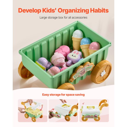 Enkel förvaringsdesign: Glassvagnen för småbarn fungerar även som en förvaringslåda, så att alla tillbehör förblir prydligt packade! En hopfällbar bakpanel sparar utrymme och gör städningen snabb och enkel. Inga fler borttappade föremål eller stökiga lekytor!
