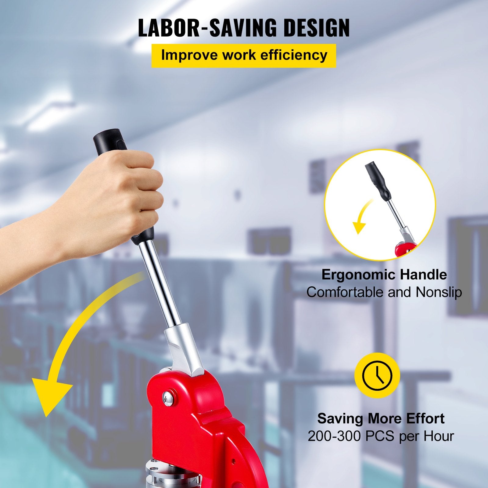 Arbetsbesparande handtag: Knapptillverkningsmaskinens handtag är designat med betoning på ergonomi. Den erbjuder ett bekvämt grepp för dig. Dessutom kommer det halkfria gummit på toppen av handtaget att förhindra olyckor.