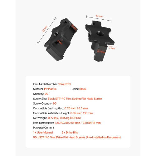 90 st dolda däckfästen för komposittrallbrädor, universella komposit-T-klämmor och dolda plastfästen med metallskruvar, polypropylen-PP-klämmor fungerar med 6,5 mm springor, svarta | EU