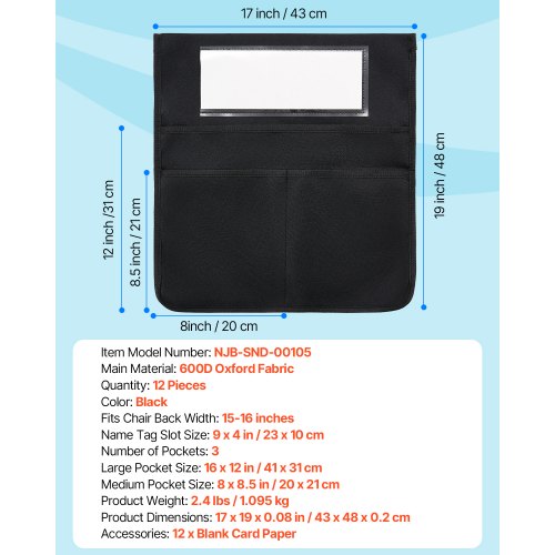 12-delat set med fickor till stolsryggar: Innehåller 12 svarta stolsfickor med namnetiketter, perfekt för årskurs 6-12. Varje väska, 43 x 49 cm, passar stolsryggar på 35-40 cm – perfekt för att organisera skrivbord och hålla allt inom räckhåll!