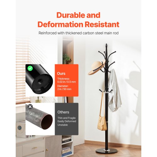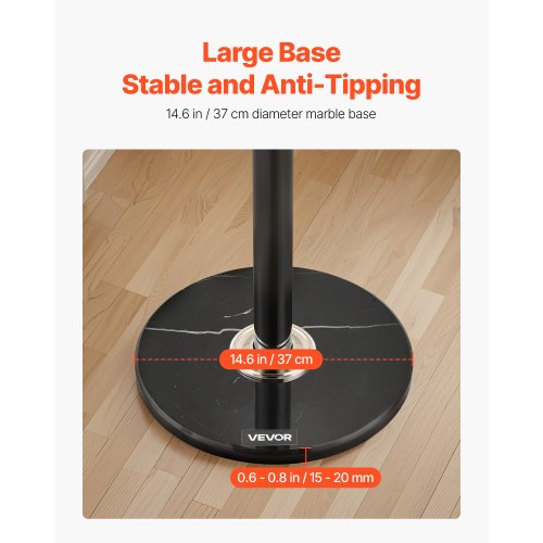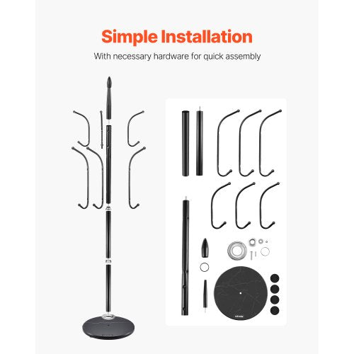 Stark lastkapacitet: Skapa ett snyggare hem med VEVOR-kapphängaren. Den har en stor marmorbas, 6 krokar och en förtjockad stång i kolstål. Varje krok rymmer upp till 3 kg, med en total kapacitet på 18 kg, vilket ger stabilt stöd för att hänga upp rockar, hattar, väskor och mer.