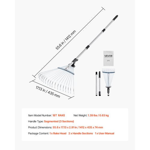 Lövkratta, 18 metallpinnar, justerbar trädgårdskratta för gräsmattor med 19,5-43,5 cm brett huvud och 82-141 cm långt handtag, kraftigt rostfritt stålverktyg för små löv för trädgårdsskötsel, camping, gårdsplan, gräs | EU