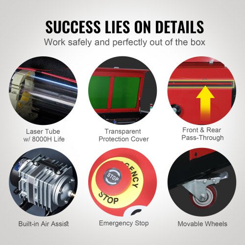 Säker och enkel användning: Arbeta med sinnesro! Det transparenta fönstret är tonat för ögonskydd, så att du kan övervaka gravyrens förlopp när som helst. Strömmen stängs av automatiskt när den öppnas. Ett nödstopp finns redo om något skulle gå snett. Vår CO₂-lasermaskin har också en luftassistans för att blåsa bort all rök, damm och gnistor. Rörliga hjul ser till att allt rullar smidigt.