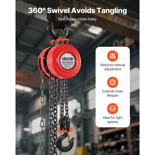 360° roterande krokar: Båda krokarna roterar 360° för enkel och flexibel positionering. Säkerhetslåset på den manuella kedjefällaren garanterar säker användning, och den justerbara lyftvinkeln håller kedjan trasselfri och ditt arbete effektivt.
