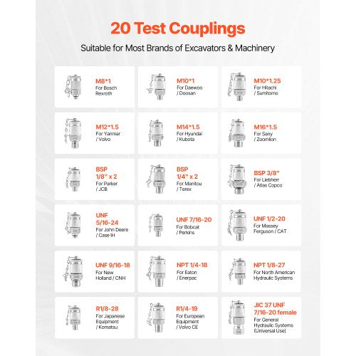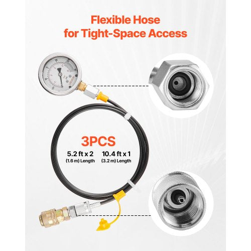 Bred kompatibilitet: Detta hydrauliska tryckmätarkit täcker G-, M-, UNF- och NPT-gängor och inkluderar snabbkopplingar av typ B och typ C för flera hydrauliska system. Den flexibla slangen förlängs enkelt in i smala eller svåråtkomliga testpunkter.