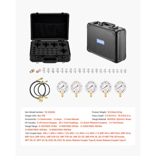 Hydraultryckstestsats, 10/60/160/400/600 bar (150/900/2300/6000/9000 psi), Hydraulisk mätaresats 5 mätare 20 kopplingar 4 snabbkopplingar 3 slangar för grävmaskin och byggmaskiner | EU