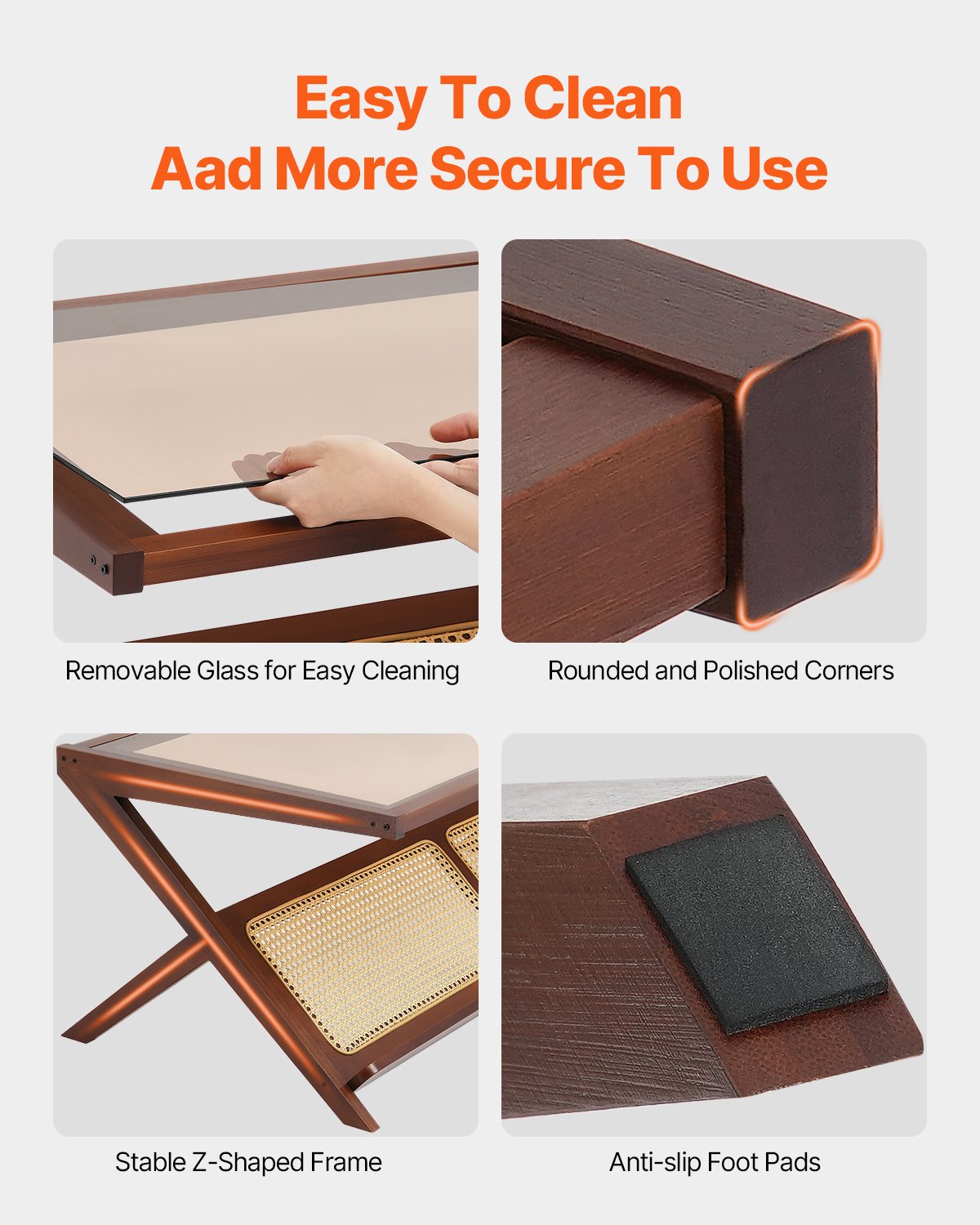 Enkel montering och rengöring: Detta soffbord i bambu har alla nödvändiga tillbehör och detaljerade instruktioner, vilket möjliggör snabb montering på cirka 15 minuter. Dess avtagbara glasskiva är lätt att rengöra - torka bara av den med en fuktig trasa.
