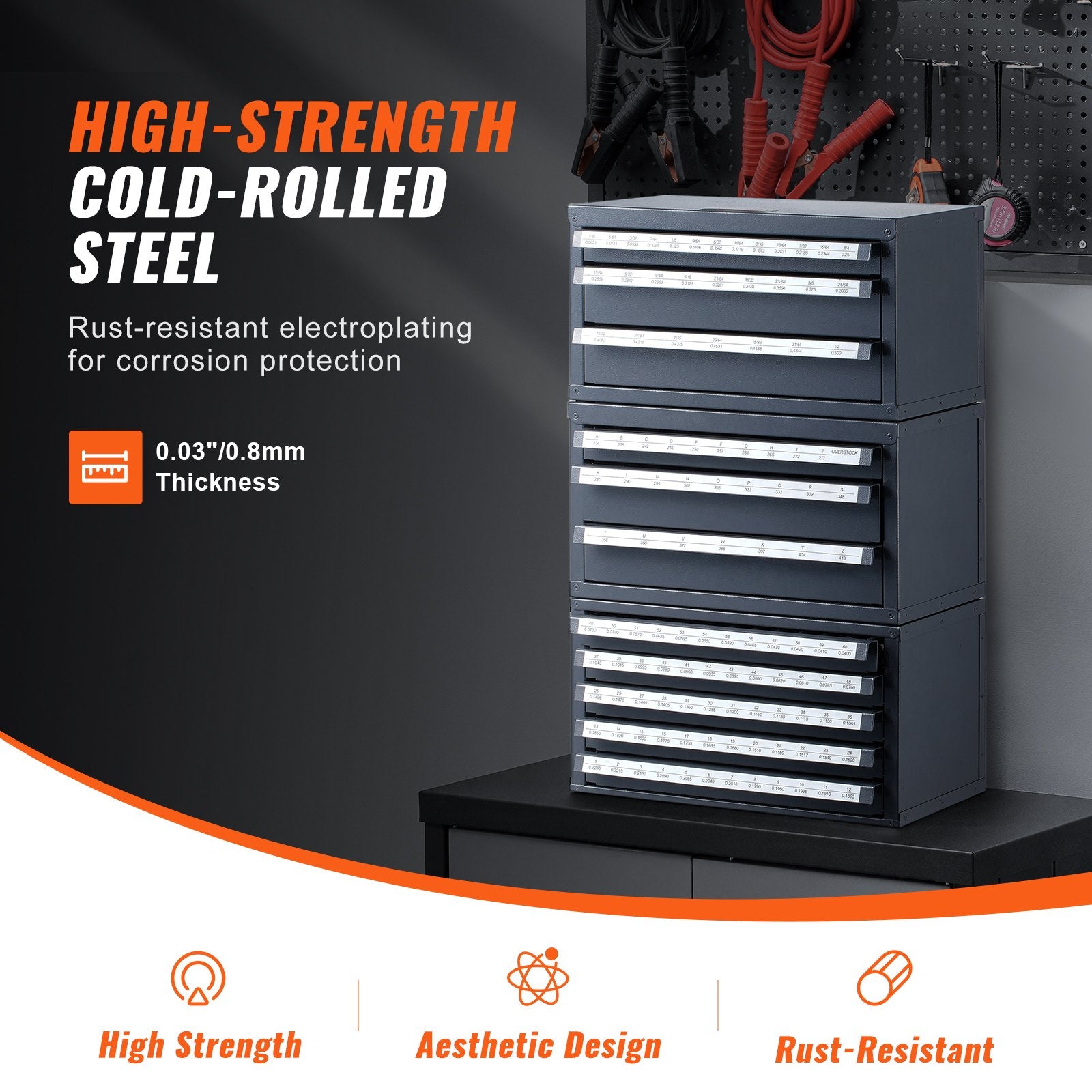 Användarvänlig design: Vårt arrangörsskåp för borrkronor har en kullagerdesign för enkel lådas glidning, vilket säkerställer en längre livslängd och smidig lådadrift. De vidgade handtagen och släta kanterna är fria från vassa kanter, vilket gör den lätt att greppa. Ha aldrig feta fingrar igen; allt är under din kontroll.