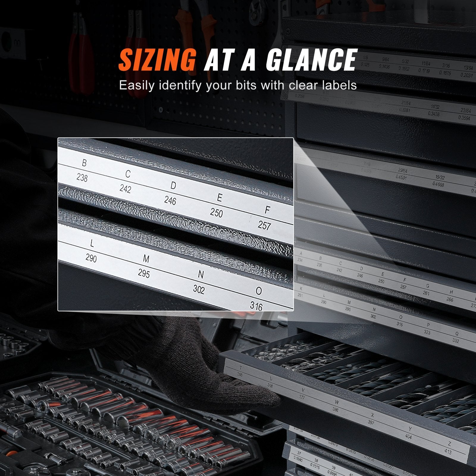 Effektiv förvaringsorganisator: Vårt 3-delade uppsättningsskåp för borrkronor förvarar din borrsamling utan ansträngning. Den rymmer borrkronor i storlek från 1/16" till 1/2", A till Ö och #1 till #60. Märkta fack möjliggör snabb identifiering och organisation.