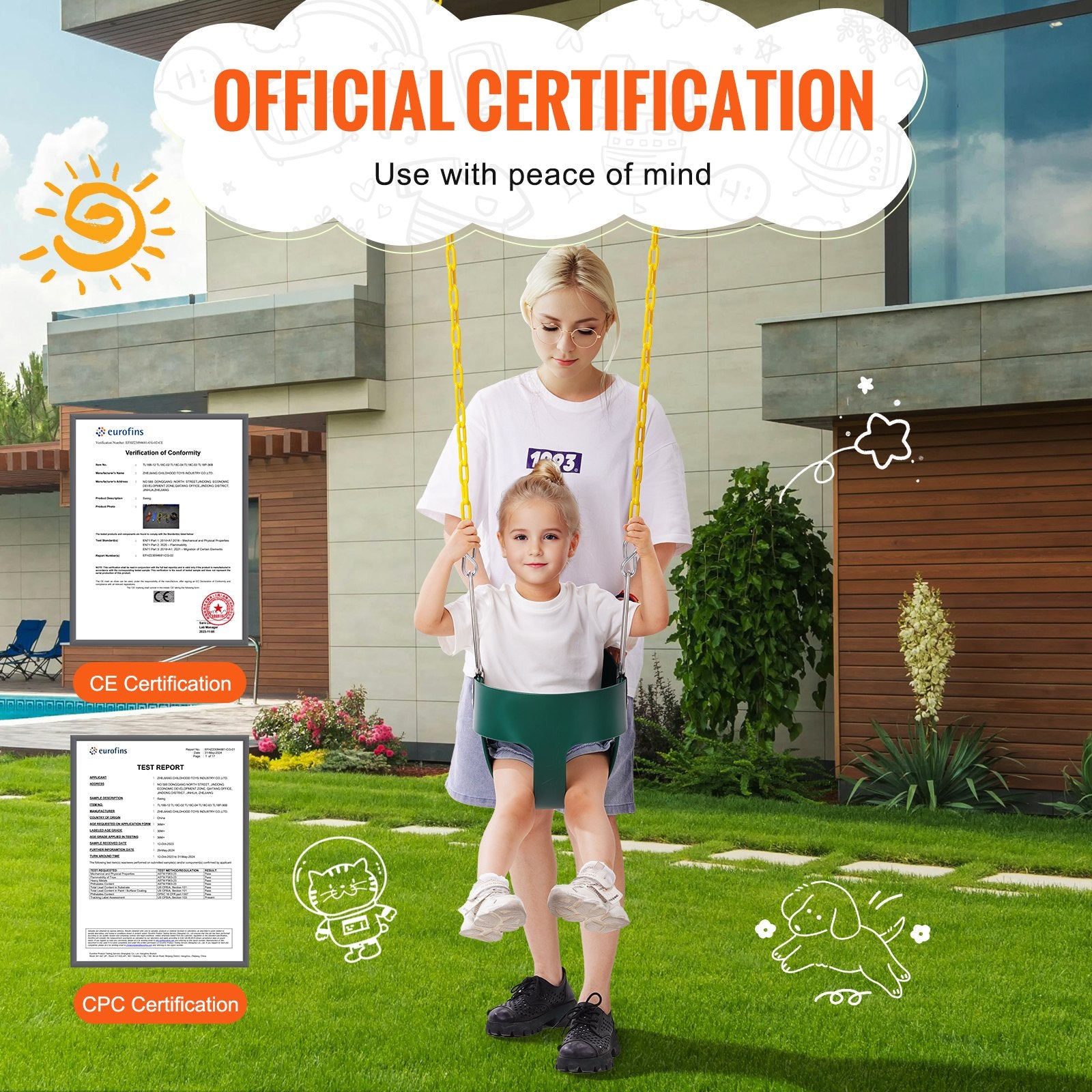 150 lbs hög belastningskapacitet: VEVOR tunga, högryggade, fullskopade småbarnsgunga stöder en maximal vikt på 150 lbs (68 kg), och rymmer äldre barn för långvarig användning. Den inkluderar kraftiga kedjor, en full hink-säte och karbinhakar för att säkerställa säker lek.