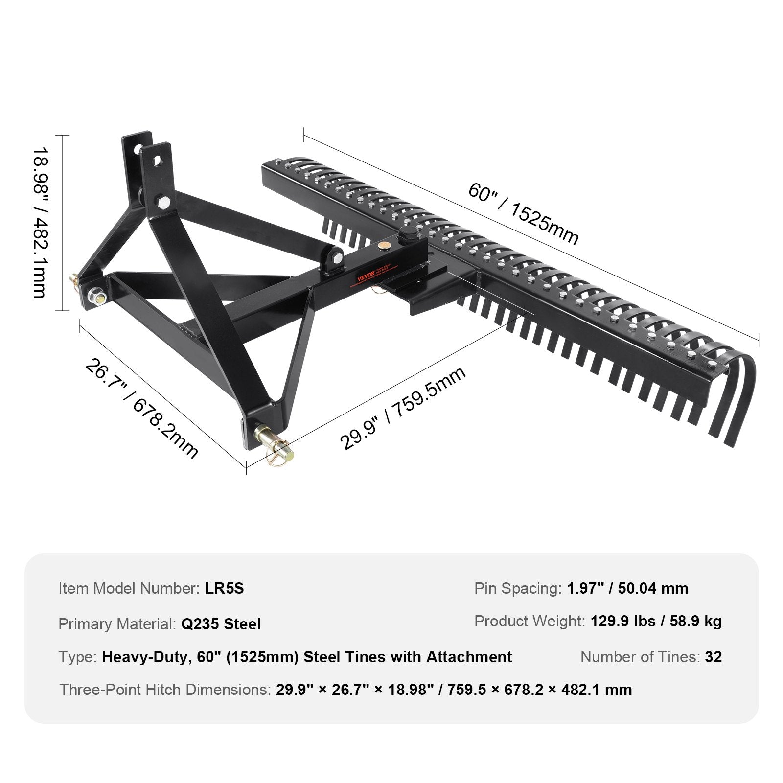 Bogsering bakom Dethatcher 60" 3-punkts Lawn Dethatcher Rake med tillbehör