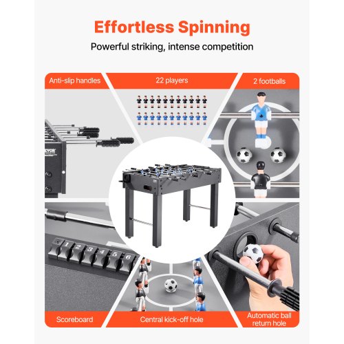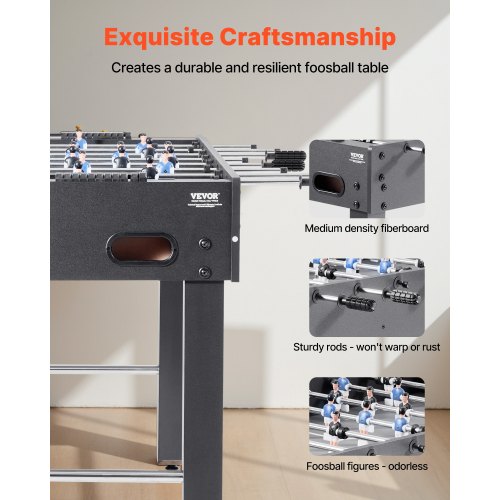 Robust och hållbart: Det 112 cm stora fotbollsbordet är tillverkat av slitstark fiberplatta med medeldensitet. Det har plats för 22 spelare och 2 fotbollar. Stavarna är raka och släta, vilket säkerställer kraftfulla slag utan att böjas eller rosta.